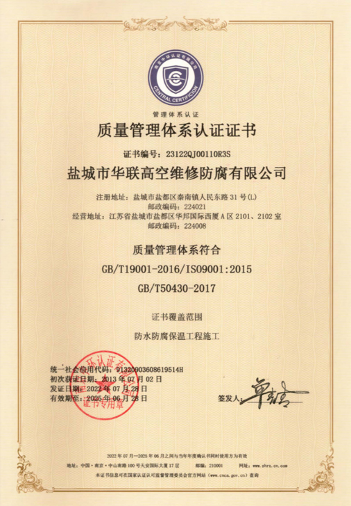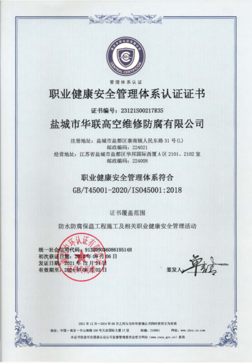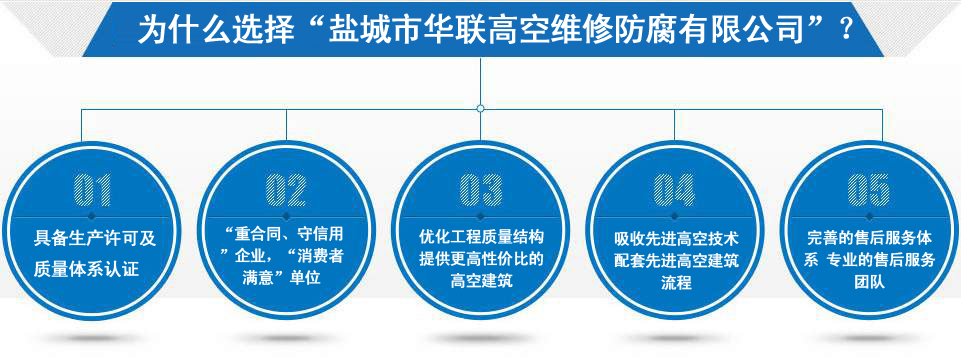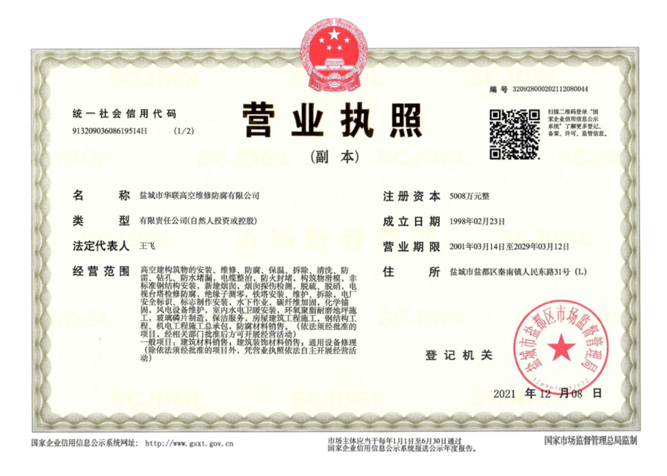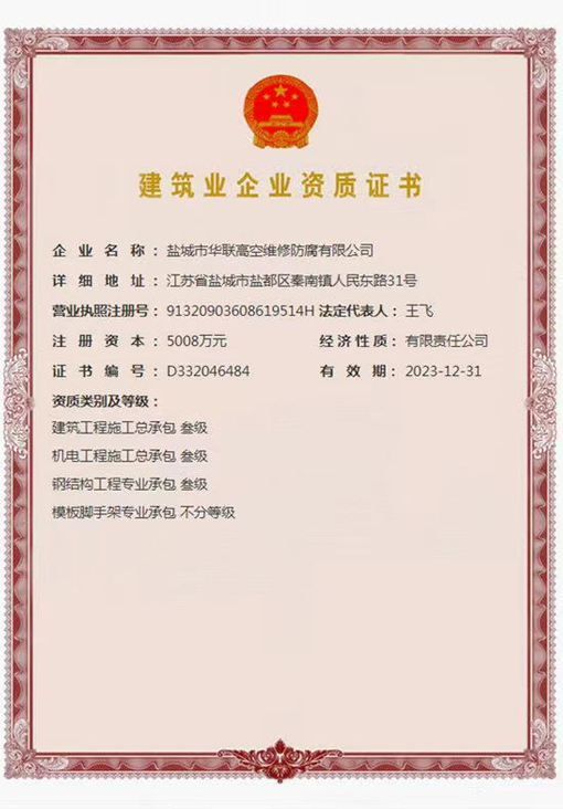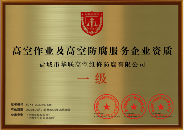 鹽城市華聯高空維修防腐有限公司始建于上世紀八十年代,系專業從事風力發電機塔筒防腐,塔筒維護,塔筒補漆,塔筒噴字等工程。不停產,不搭手架,高空懸吊施工的一級高空安全資質、一級高空防腐施工資質、二級建筑施工資質的高空建修、防腐工程、公司?,F已發展集科研、設計、施工為一體的的江蘇省較大的高空建修,高空防腐施工企業;公司注冊資金3008萬元,流動資金8000多萬元;擁有高修技術科研高修工程設計、高修工程施工三大技術與施工組織體系;公司擁有一流的技術施工隊伍,其中有高級職稱36 名,中級職稱126人。具備一級防腐資質、一級安全資質及二級建筑資質,公司下轄五個分公司和十八個辦事處,為全國數百家企業解決了若干“高、大、難”的特殊工程項目,填補了我國建筑史上的空白。